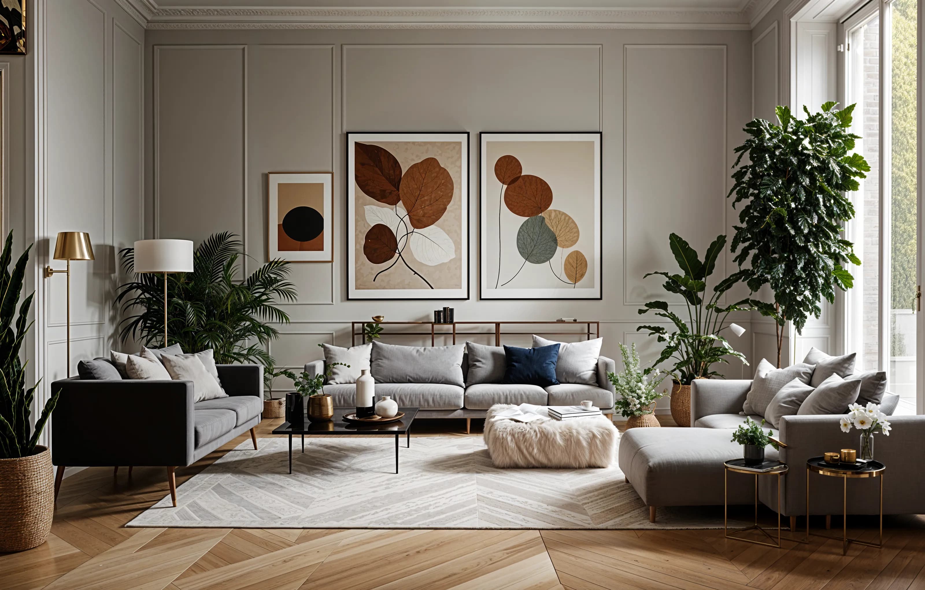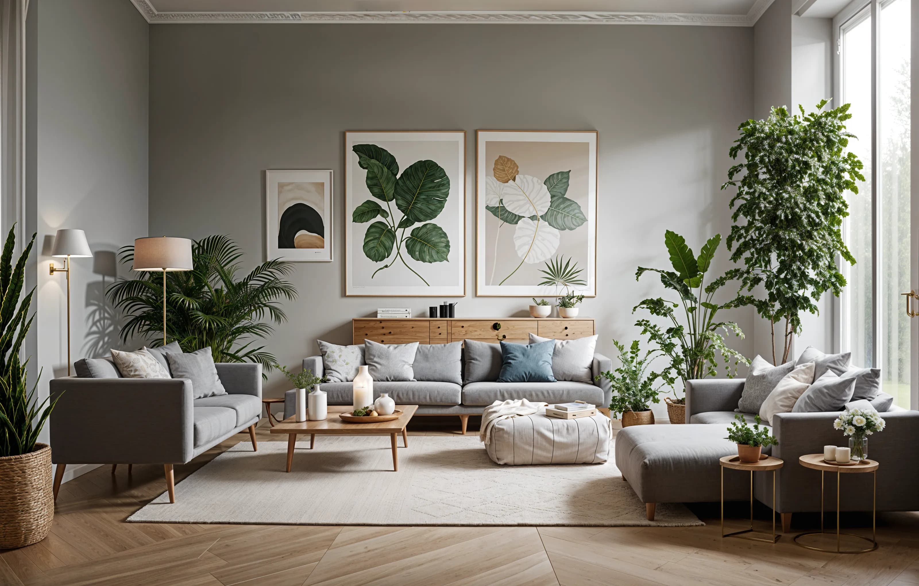 The style originates from the Nordic countries, mainly Sweden, Denmark, and Nor way. It is characterized by clean lines, simplicity, and a strong focus on light and space. It features a neutral color palette dominated by whites, grays, and soft, muted tones. Natural materials like wood and stone are commonly used, adding warmth and texture to the spaces. Open spaces and minimal decor complete the look, emphasizing a harmonious and inviting atmosphere.